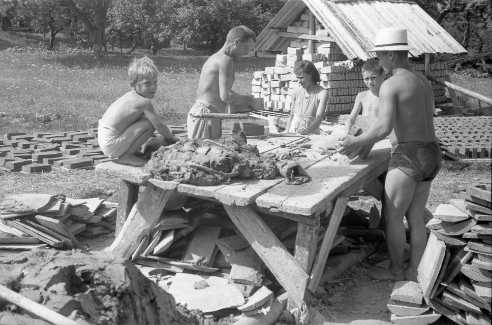 Virgilij Tavčar po koncu karantene zaradi tifusa v bataljonu. Fotografija je nastala pred kočo domačinov, ki jim je priskrbel hrano. Ob njem sta deklici Tamara in Katjuša. Ukrajinsko mesto Krasnoarmiysk (tedaj Grishino) v Doneškem bazenu, julija 1942. Fotografija je iz albuma Virgilija Tavčarja.