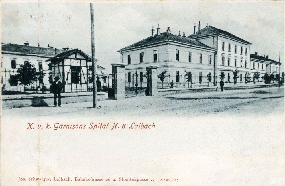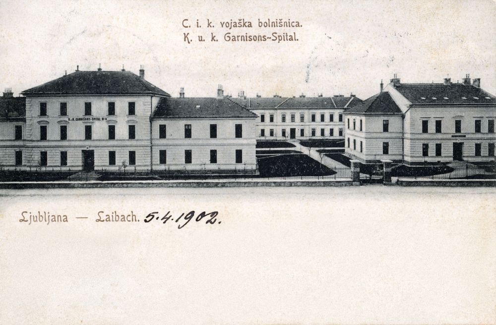 Pogled na poslopja C. in kr. vojaške bolnišnice št. 8 v Ljubljani, 5. 4. 1902. (MNSZS, zbirka razglednic, inv. št. 33691, 13,9 x 9 cm)