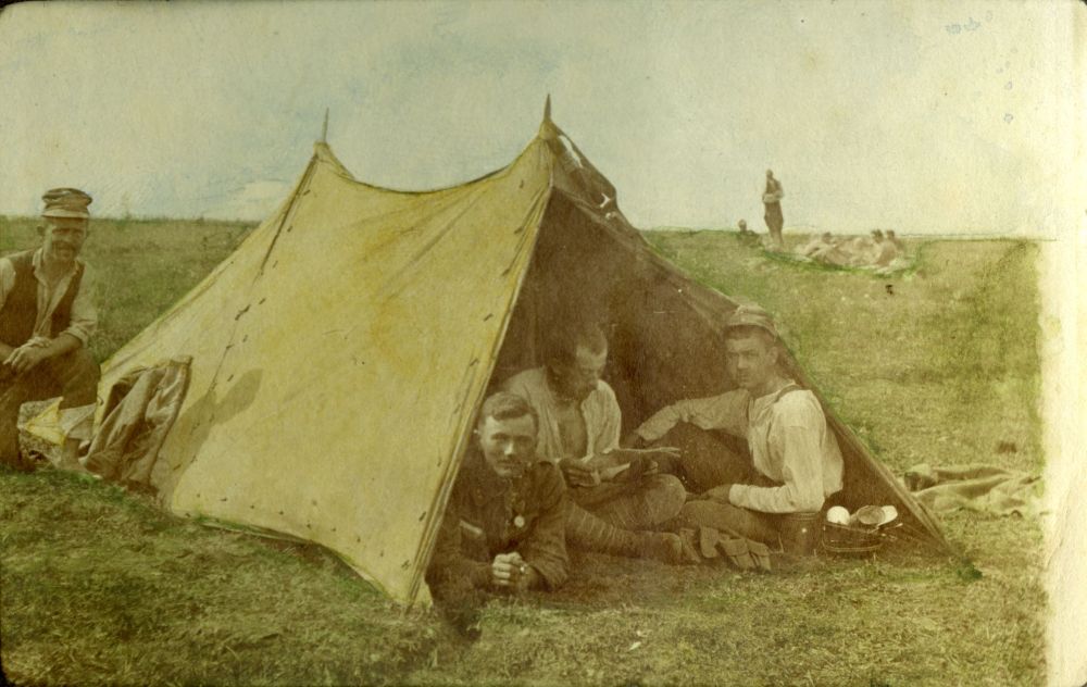 V precej bogati muzejski fotografski zbirki prve svetovne vojne ne hranimo barvnih fotografij. Hranimo pa obarvano črno-belo fotografijo, ki zaradi avtorjevega posega, kljub uporabljeni skromni barvni lestvici, izstopa od ostalih rjavo toniranih črno-belih fotografij v zbirki. Na njej so avstro-ogrski vojaki v vojaškem šotoru v prostem času. Ali jo je lastnik obarval zaradi preprostega motiva, ki za razliko od številnih drugih ni potreboval zahtevnejšega barvnega spektra ali česa drugega, verjetno ne bomo nikoli izvedeli. Očitno si je želel ohraniti barvno podobo doživetega. Njegov le delno uspel poskus barvanja, razen poudarjene beline platnenih vojaških srajc in morda povečane »globine«, ne okrepi nobene druge podrobnosti na fotografiji. Kljub temu z dodanimi barvami spremeni gledalčev vtis o fotografiji.