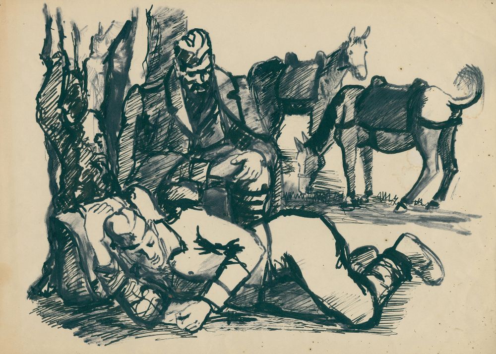 Risba Počivajoča mulovodca prikazuje kratek, tih trenutek znotraj izčrpavajočega vsakdana partizanske vojne. Umetnik Drago Vidmar je v tehniki tuša ujel dva partizana mulovodca v času počitka. Eden leži in izmučen spi, drugi sedi z rahlo sklonjeno glavo, morda v mislih ali na straži. V ozadju mirno stojijo in se mule, ki so bile ključno prevozno sredstvo partizanske logistike. Mulovodci so v partizanskem zaledju igrali ključno vlogo, saj so oskrbovali enote s strelivom, hrano, zdravili in tiskovinami, pogosto na težko prehodnem terenu in v nevarnih okoliščinah. Bili so nevidni, a nepogrešljivi člani odporniške strukture. Vidmarjeva risba je tiho priznanje tej vlogi, in sicer ne kot slavljenje junaštva, temveč kot likovni poklon vsakdanji požrtvovalnosti. Risba s svojo sproščeno, a poudarjeno linijo ustvarja močan občutek telesnosti, utrujenosti in tišine. Temne sence in ekspresivno modelirane oblike ustvarjajo občutek teže, hkrati pa delujejo tudi empatično, saj umetnik ne prikazuje boja, temveč človeško izčrpanost.