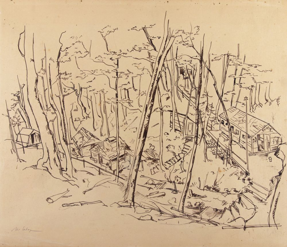 Mirko Lebez je v pričujočem delu upodobil skrito partizansko bolnišnico, umeščeno v gosto gozdno okolje. Prikaz lesenih barak, ki se razprostirajo med vitkimi debli in neravnim terenom, deluje dokumentarno, a hkrati osebnostno doživeto. Bolnica je ujeta v preplet drevesnih linij, ki jo ščitijo in obenem zakrivajo, kakor je tudi v realnosti narava varovala ranjene pred sovražnikom. Z likovnega vidika delo zaznamuje preprosta, a izrazita risba s tankimi, odločno zarisanimi črtami. Lebez v tem primeru ni posegal po senčenju ali dodatnih slikarskih efektih, saj zgoščena mreža linij in premišljeno urejen prostor zadostujeta za ustvarjanje občutka prostorske globine. Dinamično prepletanje vertikal debel in diagonalnih potez daje prizoru napetost, medtem ko mirno umeščene barake vzpostavljajo kontrast stabilnosti in reda. S tem je umetnik dosegel ravnovesje med dokumentarno natančnostjo in izrazno močjo, ki gledalca spomni na tiho, a junaško zgodbo partizanskih bolnic.